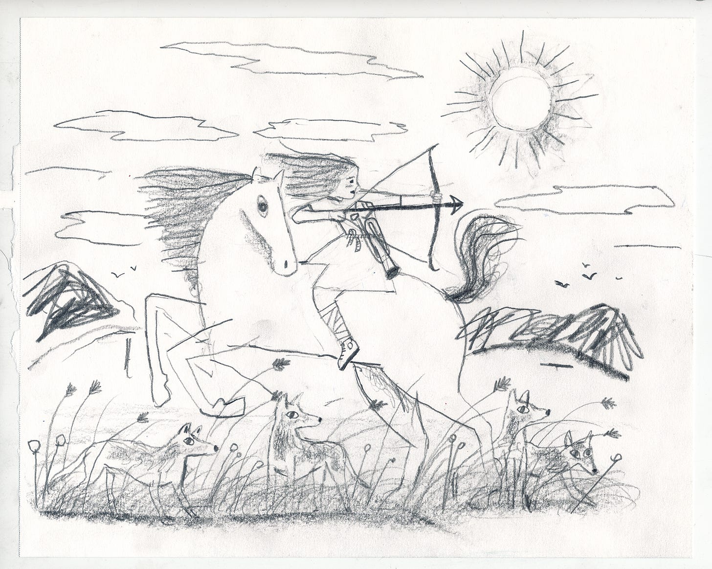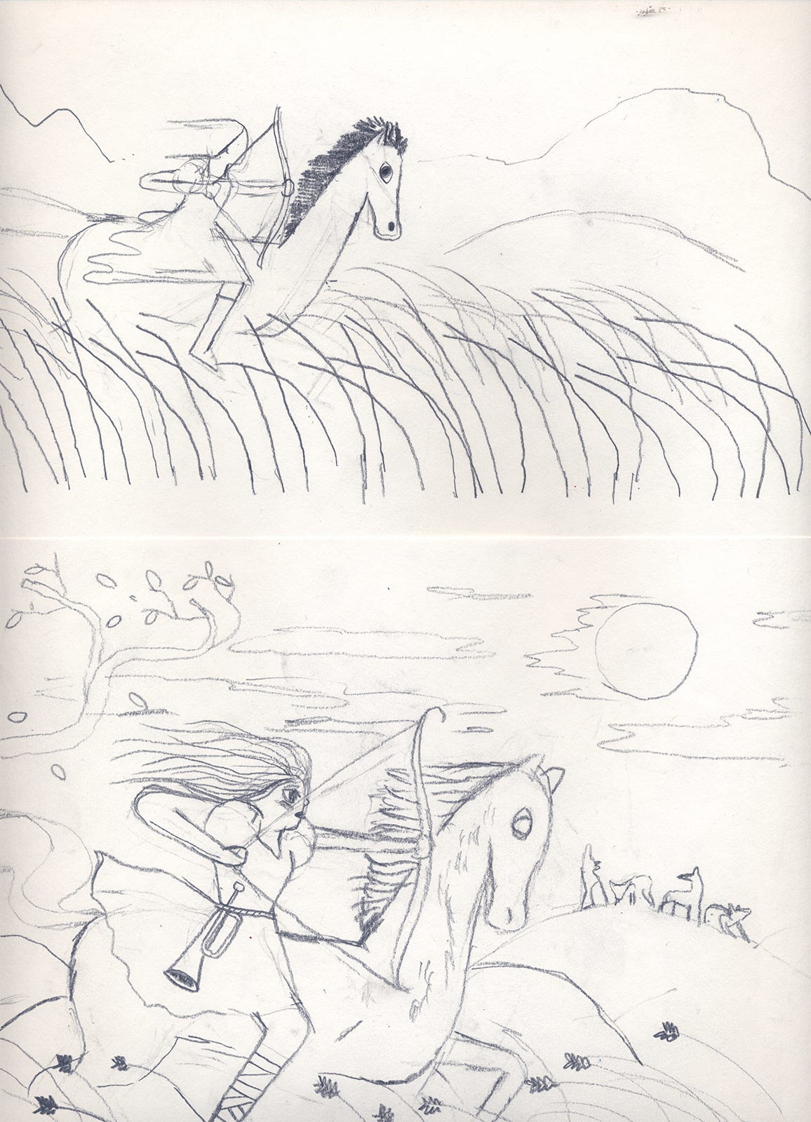 I made a sketch in my sketch book and liked it but wanted a little more room to draw so I grabbed a few sheets of loose drawing paper. For some reason I didn’t included the deer in my drawings which was my favorite part of the poem. I was also reminded how difficult and awkward it can be to draw horses. I did a few passes that just weren’t working.