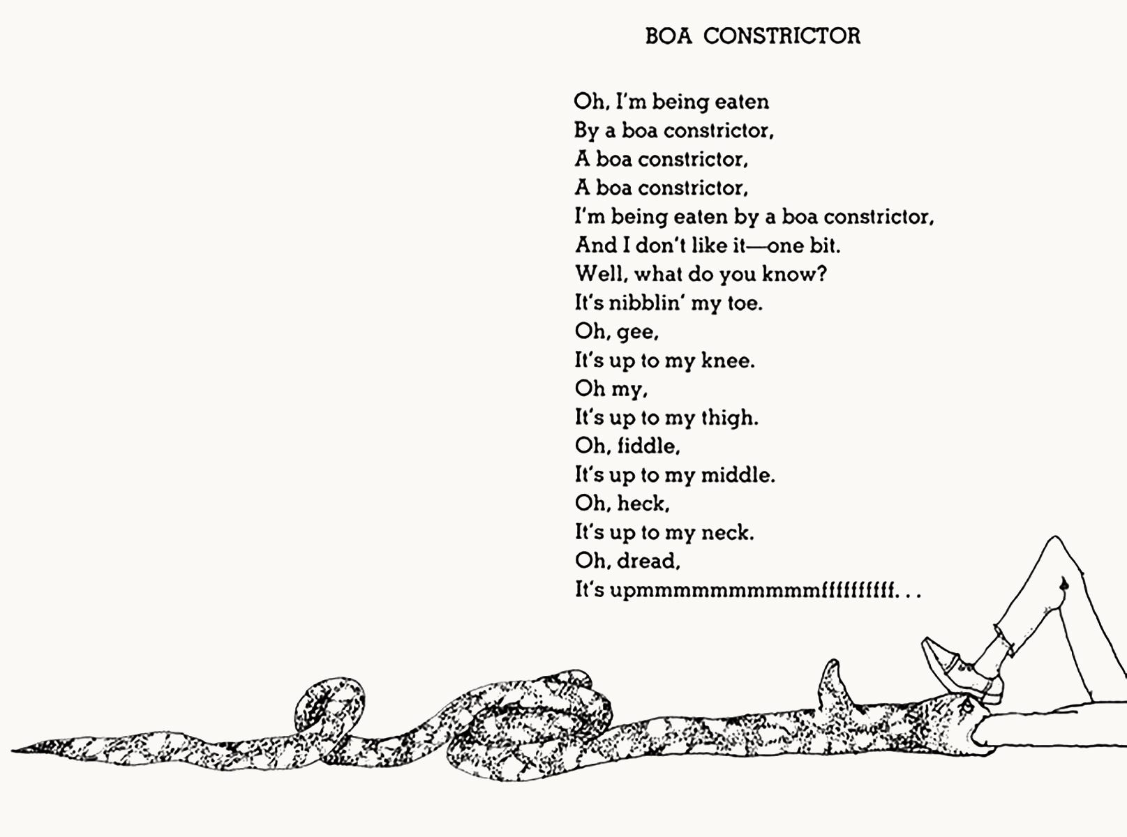 As a kid, one of my most favorite books was a collection of poems, Where the Sidewalk Ends by Shel Silverstein. My mother would read from it at bedtime—requested favorites were Captain Hook and Boa Constrictor.
