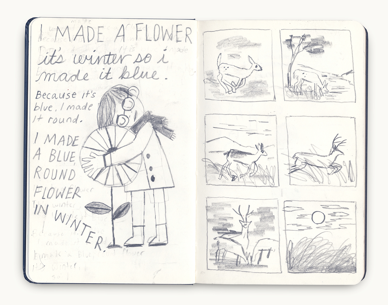 A few days later, I decided to do this little sequential drawing about the deer and on the opposite page drew a flower and made a little poem. When I’m writing, I often think about Beatles Lyrics and these few words make me think of the song Because.